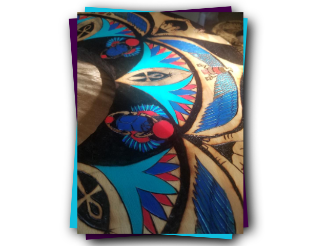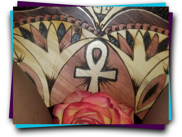 Around each of the circles wood burned on the Seat of Life, hands are also burned in the shapes of various mudras.
